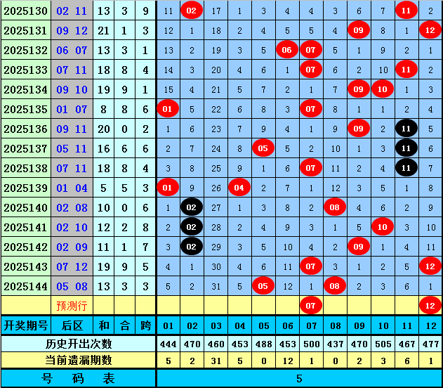 后差别析:上期后区开出奖号05和08,在最近50期开奖中,后区奖号012路落号比为26:35:39,前10期后区012路落号比为3:7:10,本期后区温雅号码04、07、10、11、12,两码参考07、12。